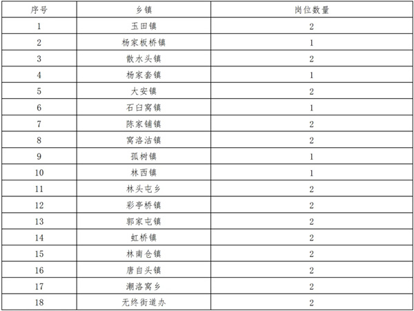 經(jīng)面向基層單位征求意見,共有彩亭橋鎮(zhèn)、大安鎮(zhèn)、孤樹鎮(zhèn)、郭家屯鎮(zhèn)、虹橋鎮(zhèn)、林南倉(cāng)鎮(zhèn)、林西鎮(zhèn)、散水頭鎮(zhèn)、石臼窩鎮(zhèn)、唐自頭鎮(zhèn)、窩洛沽鎮(zhèn)、陳家鋪鎮(zhèn)、楊家板橋鎮(zhèn)、楊家套鎮(zhèn)、玉田鎮(zhèn)、、林頭屯鄉(xiāng)、潮洛窩鄉(xiāng)等17家鄉(xiāng)鎮(zhèn)政府及無(wú)終街道辦事處(崗位分配見附件)。