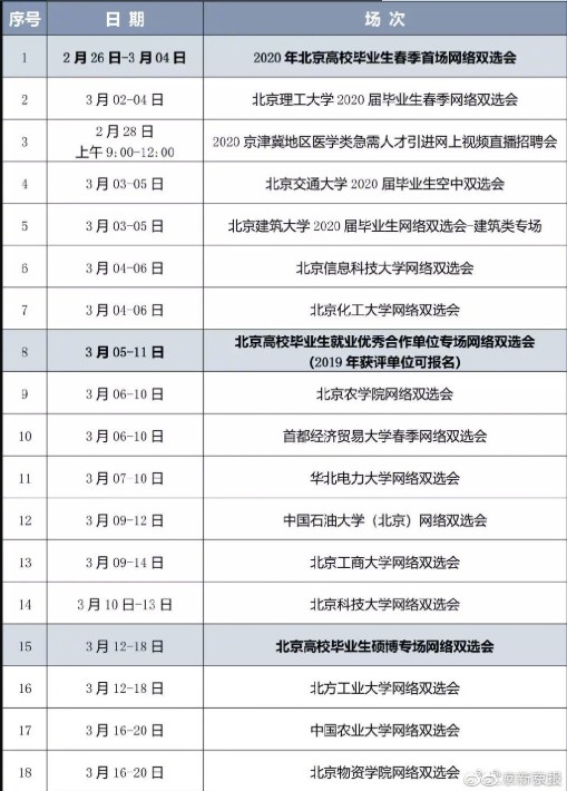 北京將開展畢業(yè)生網(wǎng)上雙選會 【北京畢業(yè)生就業(yè)新政出爐:網(wǎng)簽協(xié)議、網(wǎng)上辦手續(xù)】 針對特殊時期的畢業(yè)生就業(yè)工作,北京將開展“北京地區(qū)2020屆高校畢業(yè)